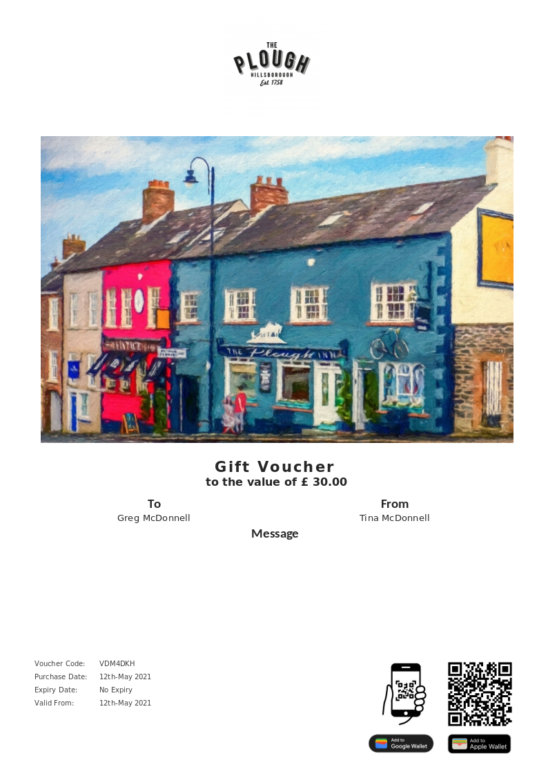 The Plough Inn allows you to purchase instantly printable gift vouchers, special offers and tickets using the Voucher Connect platform.